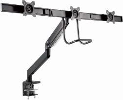 This adjustable monitor mount allows comfortable placement of three screens side by side, ideal for professional work environments. Thanks to its robust metal build and flexible arms, it offers maximum stability and adaptability.