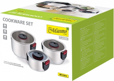 Enrich your kitchen with a touch of style and functionality with the Maestro Elegance Cookware Set. This set is crafted from stainless steel, providing long-lasting durability and resistance to corrosion. The elegant black and red design makes it an excellent complement to any kitchen interior.