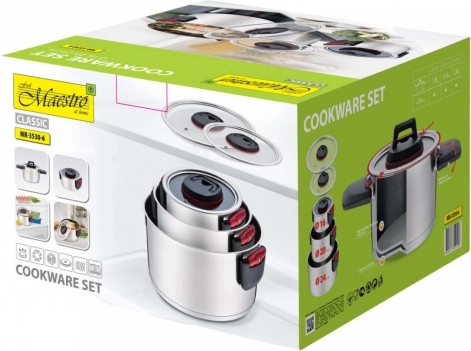 The Maestro Cookware Set made of high-quality stainless steel is an ideal solution for any kitchen due to its elegant design and compatibility with all types of cooktops.