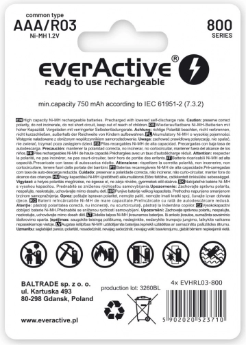 The rechargeable AAA R03 800 mAh batteries in the Ready To Use version come pre-charged from the factory, so you can insert them into your device right away. The Silver Line series builds on the quality of the Professional range while offering excellent value for money.