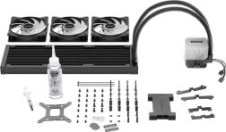 Light Loop 360mm Black best complements all-black systems with its uniform black aesthetic. Integrated ARGB LED lighting in the cooling block and fans lets the vivid illumination take center stage.