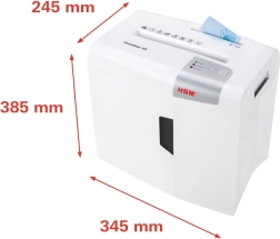 The HSM Shredstar X5 is a modern shredder that combines a high level of security with simple operation. It shreds documents into fine 4 × 30 mm particles (security level P-4) and features a separate feed and cutting unit for CDs/DVDs, allowing convenient waste sorting into separate bins.