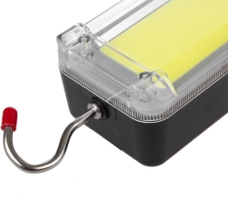 For maximum flexibility, the lamp features a rotating hook for hanging, magnets for attaching to metal surfaces, and a clip in the rotating handle for secure fastening to a table or shelf. Power from two 1200 mAh rechargeable batteries provides up to 4–6 hours of runtime, and charging is easy via the USB cable.