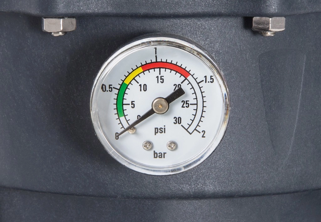 Conveniently switch between filter, backwash, rinse, recirculate, drain, and closed modes. The pressure gauge shows when it’s time to backwash.