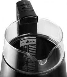 The kettle is easy to operate and maintain, thanks to the removable lid with an integrated filter against scale deposits and a large filling opening. A smooth base with a hidden heating coil prevents limescale formation, and a large water gauge allows easy monitoring of the water amount inside the kettle. A fully rotatable base offers space for storing excess cable.
