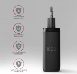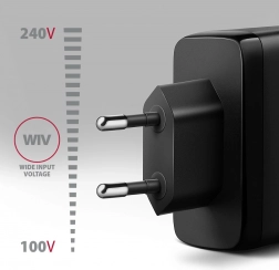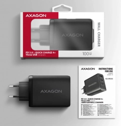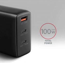 Axagon ACU‑DPQ100 is a universal charger with a maximum output of 100 W that can power a laptop, phone, and earphones at the same time. Two reversible USB‑C with Power Delivery ports and a classic USB‑A with Quick Charge ensure the highest possible charging speeds. Modern GaN technology delivers higher efficiency and smaller dimensions – an ideal solution for travel and the desk.
