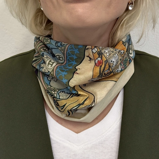 Discover an elegant bandana inspired by the iconic Art Nouveau aesthetics of Alfons Mucha. The Zodiac motif lends your outfit an artistic and timeless character, while the lightweight polyester ensures comfortable wear and easy care.