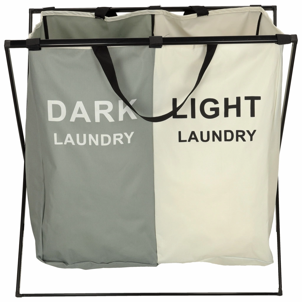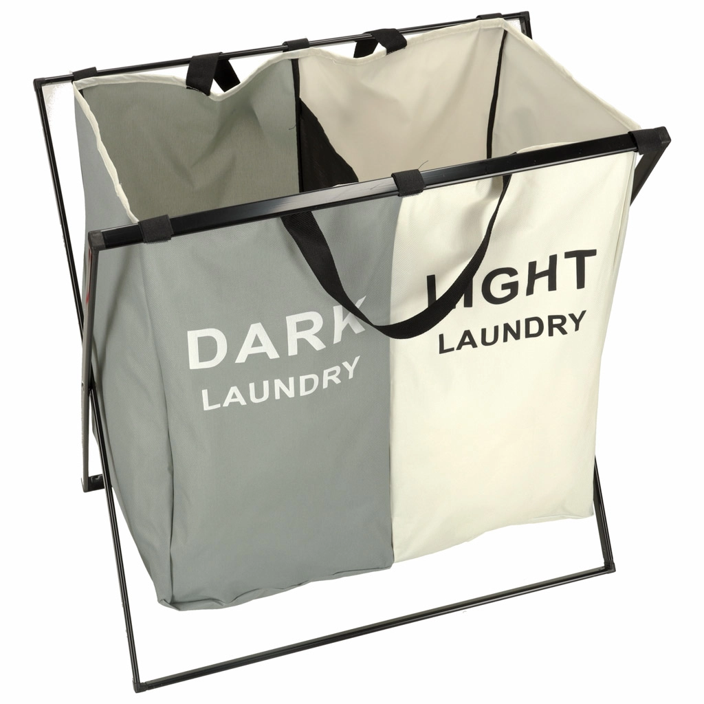 Keep your bathroom and laundry room perfectly organized with this two-compartment laundry basket that enables immediate sorting of light and dark laundry. The durable fabric bags are mounted on a sturdy aluminum frame that is lightweight, stable, and easy to assemble and handle.