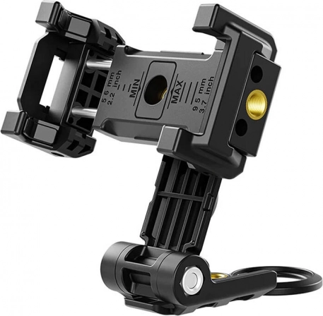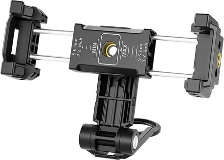 Thanks to its wide clamping range of 56–95 mm, it fits most phones. V-shaped rubber inserts ensure a secure grip without damage, while two 1/4" threads on the body and base allow easy mounting on a tripod, arm, or selfie stick. The folding design also serves as a desktop stand for movies, meetings, and browsing.