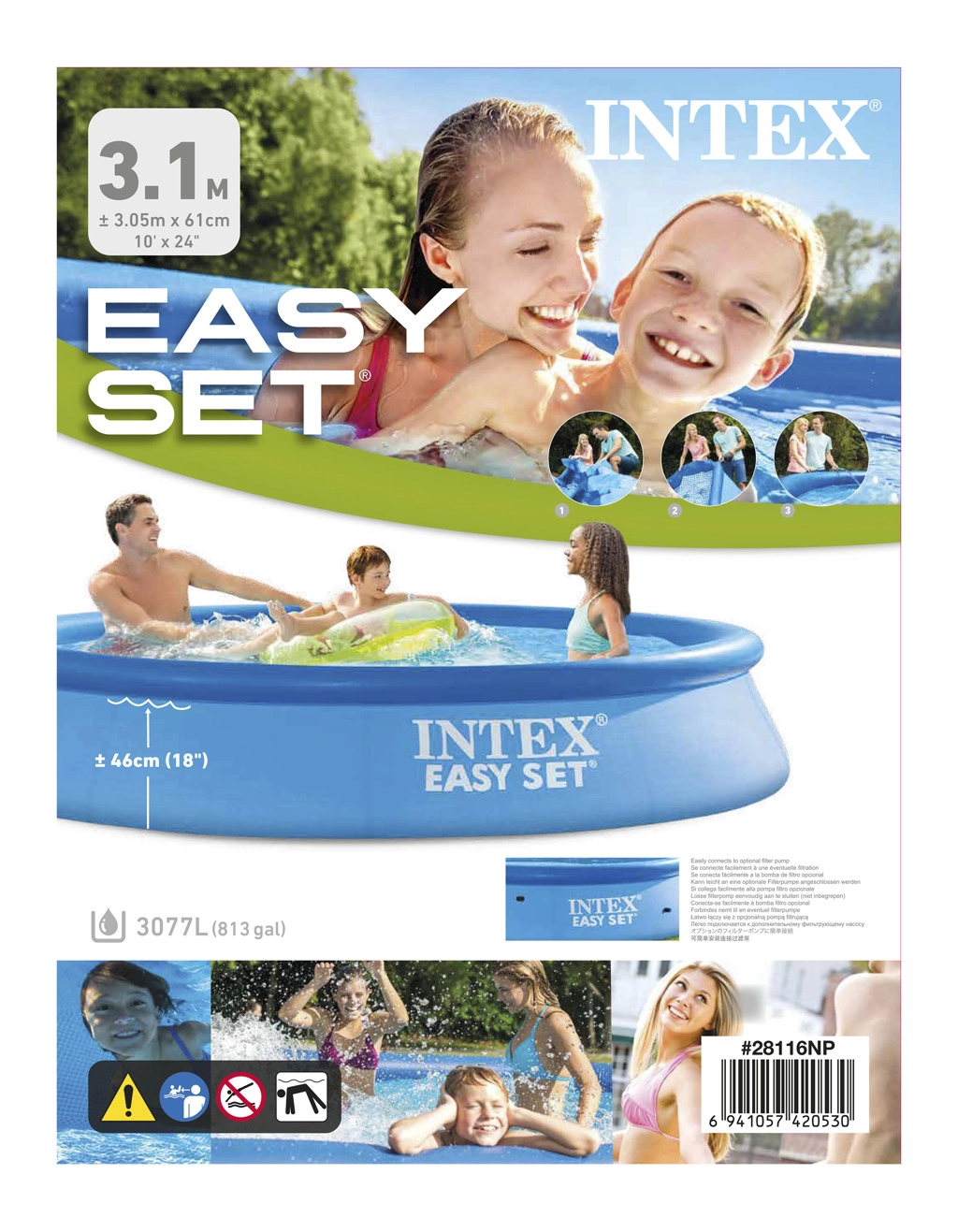 A practical solution for hot days in your garden. The INTEX Easy Set pool is designed for quick and convenient setup without demanding installation. Thanks to its self-supporting structure, the pool rises as water is added and is ready for a refreshing dip in no time. The interior print in a white-blue mosaic gives the water a clean and pleasant look.