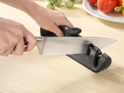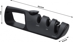 An ergonomic handle and non-slip base hold the sharpener firmly in place. Compact dimensions 26.5 × 4.5 × 7 cm fit any kitchen.