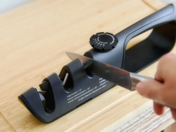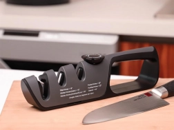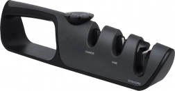 This practical kitchen sharpener with three slots quickly restores the edges of your knives and scissors. Thanks to the adjustable 14–24° sharpening angle, you can precisely tailor sharpening to European and Japanese blades alike. The coarse stage repairs very dull edges, the fine stage smooths and polishes, and the dedicated scissors slot ensures a sharp, clean cut.