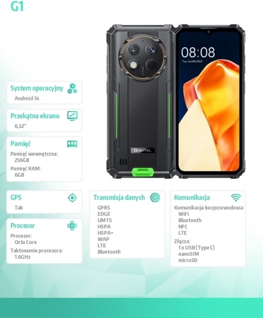 The Oukitel smartphone is equipped with a large 6.52" HD+ display featuring In-cell technology and Corning Gorilla Glass 5 protection, ensuring bright and sharp images even when operated with gloves. The powerful octa-core Unisoc T606 processor combined with 6 GB RAM and 256 GB internal storage (expandable up to 1 TB) provides smooth operation on Android 14 and plenty of space for applications.