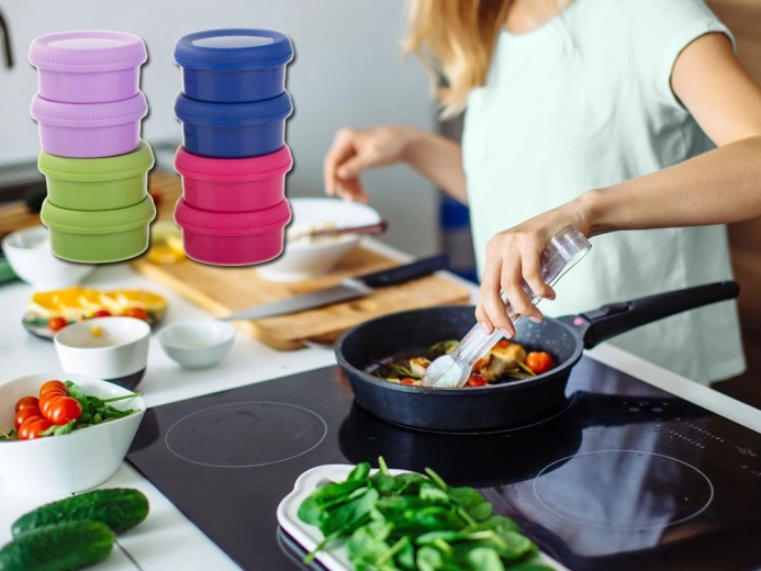 The containers are made from BPA-free, food-safe plastic. They’re easy to maintain and can be washed by hand or in the dishwasher. The various lid colors help you identify contents quickly without opening—ideal for ketchup, mayonnaise, mustard, hummus, spices, or nuts.