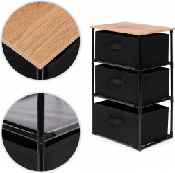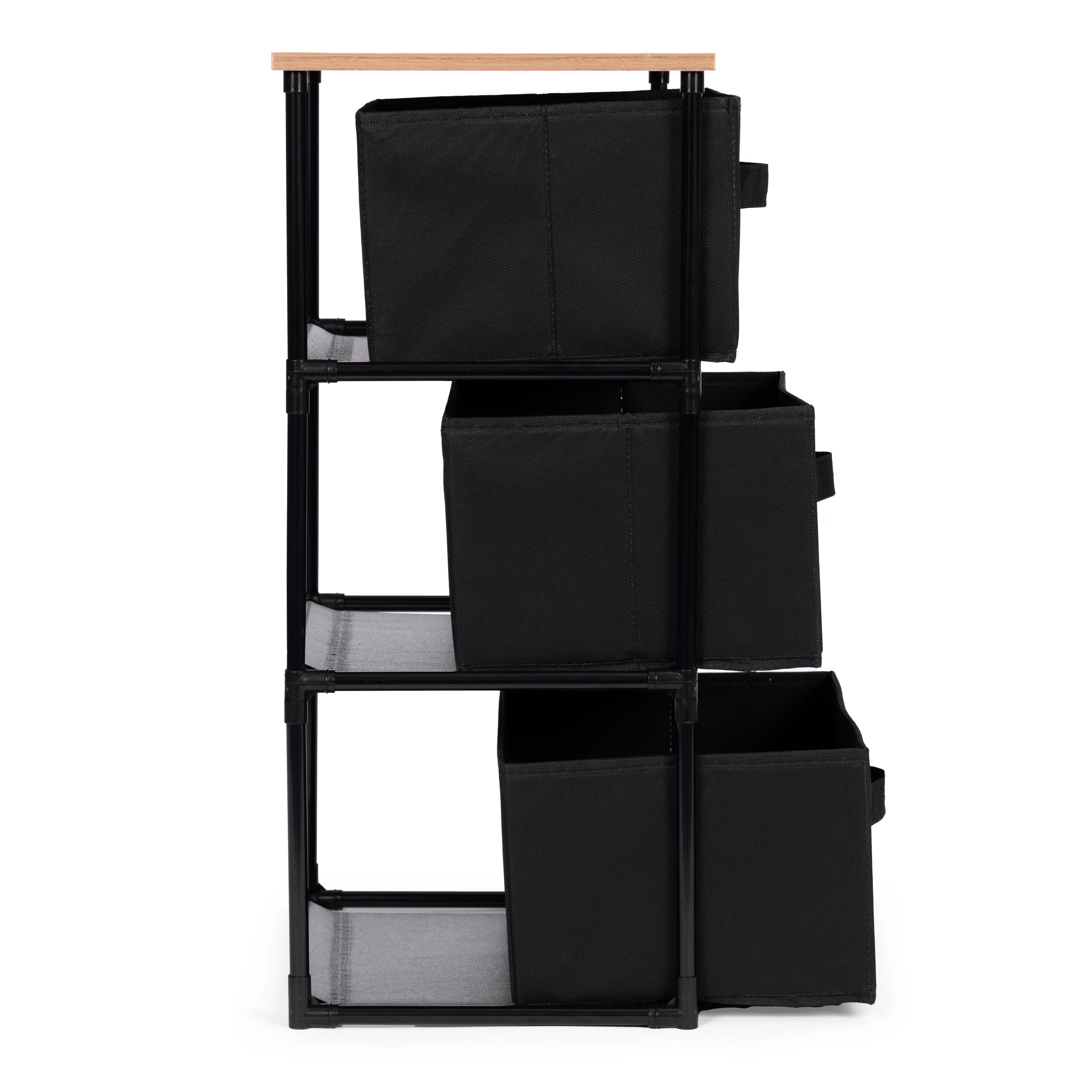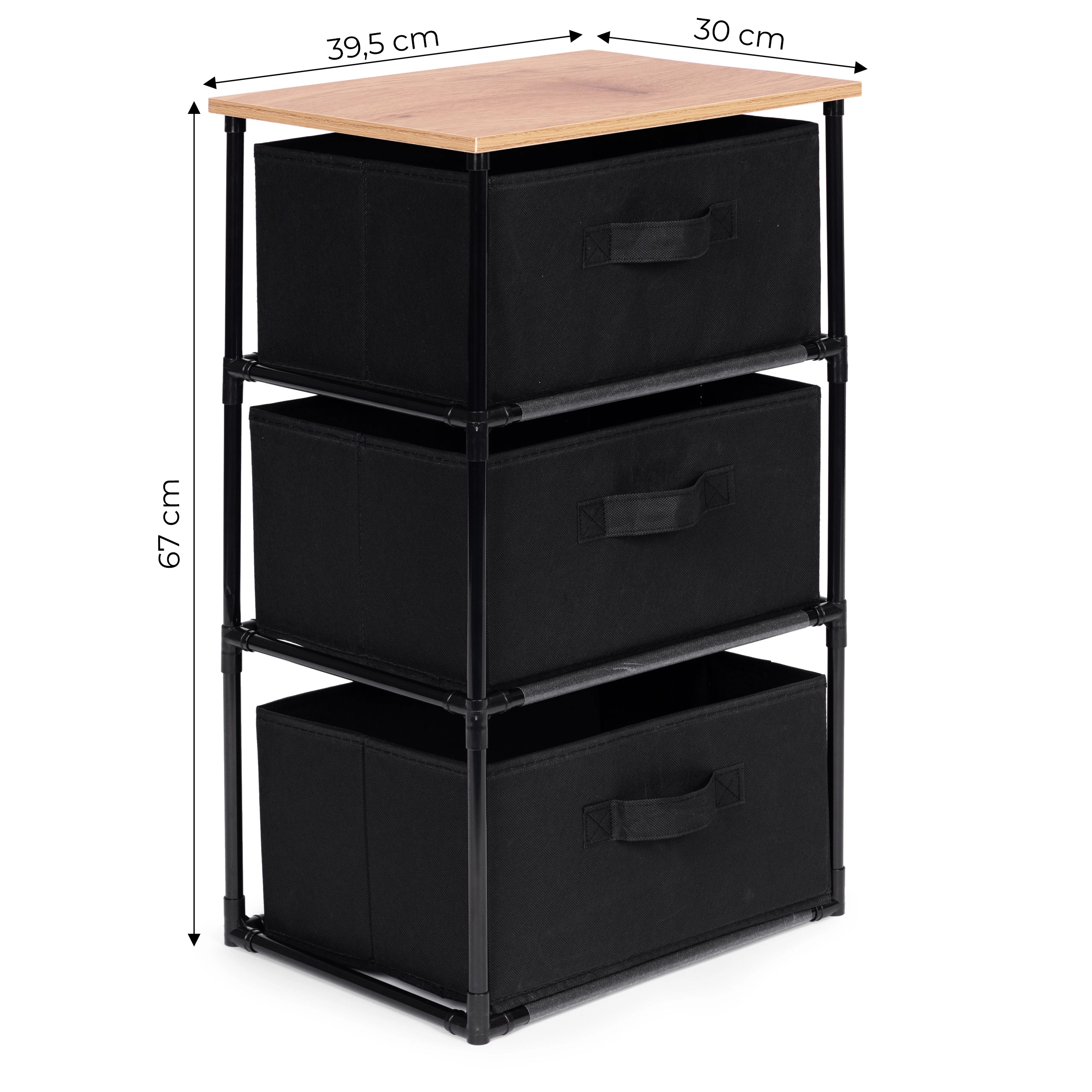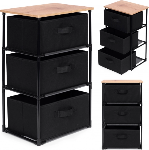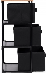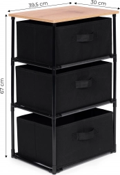 The rack includes three removable baskets made of durable textile, suitable for storing clothes, books, toys, and other items with easy access thanks to practical handles.