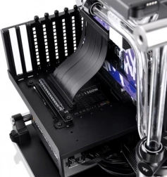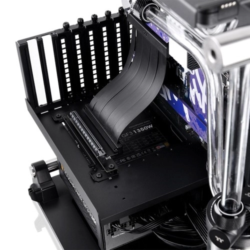 The Thermaltake PCI-E 4.0 cable with vertical mounting design and a length of 130 mm is ideal for the most demanding gaming systems. It supports a wide range of GPU solutions thanks to features like dual 90° angle, high transfer speed, and EMI shielding.
