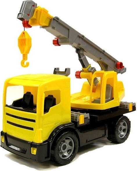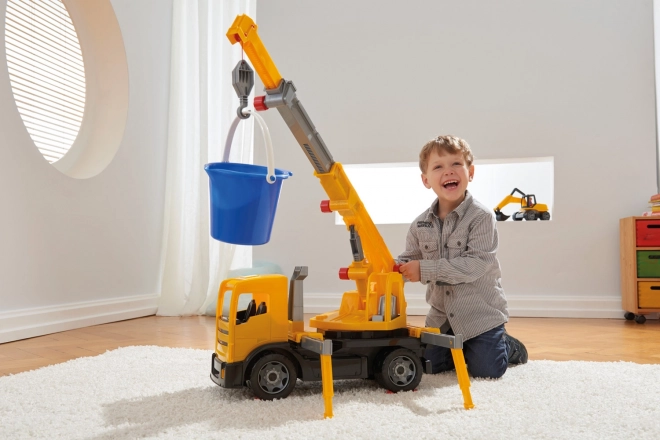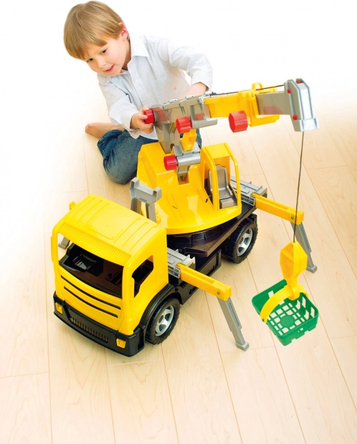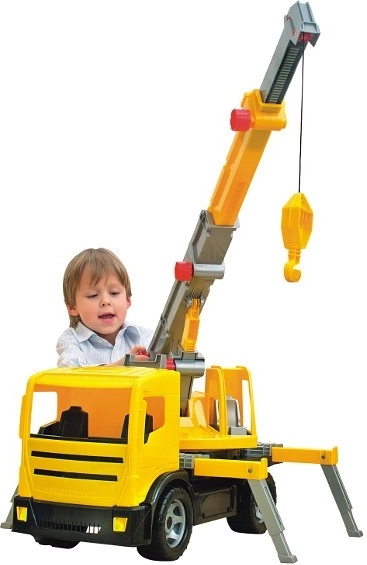 Mechanical knobs for extending and lifting the boom, plus a winch with a cable, deliver authentic construction-site fun and support motor skill development.