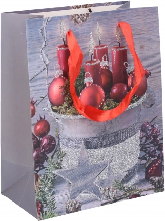 Paper Christmas gift bag, Size S (18 × 23 × 10 cm) with sturdy handles. Elegant, quick wrapping for smaller gifts: books, cosmetics, or toys.