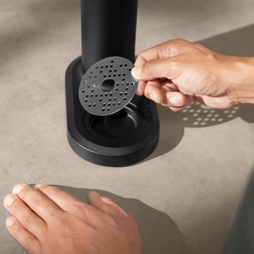 The device operates entirely without electricity, is compatible with universal CO2 cylinders, and features a modern, space-saving design. A removable nozzle and a magnetic stainless-steel drip grid make maintenance significantly easier. For the best taste, we recommend using BRITA-filtered water.