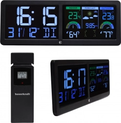 A modern wireless weather station with an outdoor sensor offers precise temperature and humidity measurement indoors and outdoors, a color LCD display with adjustable brightness, and radio-controlled clock with alarm and calendar. It also includes a barometer, 12–24 h weather forecast, and display of moon phases.