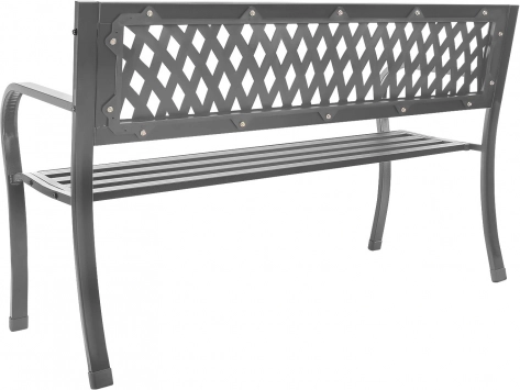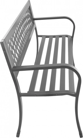 An elegant garden bench in graphite is ideal for the garden, terrace, and balcony. It features a sturdy metal frame made of steel and cast iron, weather resistance, and an ergonomic backrest for comfortable relaxation. Non-slip foot caps enhance stability, and the timeless open (lattice) design adds style to your space.