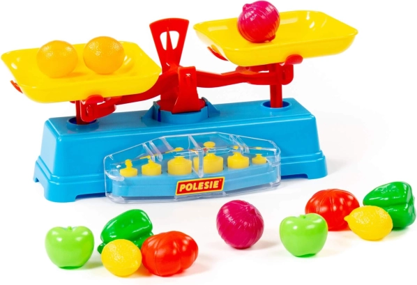 The kids’ scale with accessories is perfect for pretend play in a shop or kitchen. While playing, children gently learn the basics of counting, comparing, and a sense of balance. The set includes colorful plastic play food that encourages creative play and expands vocabulary.