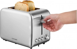 The toaster ensures perfectly toasted slices with automatic popping up and a simple control panel.
