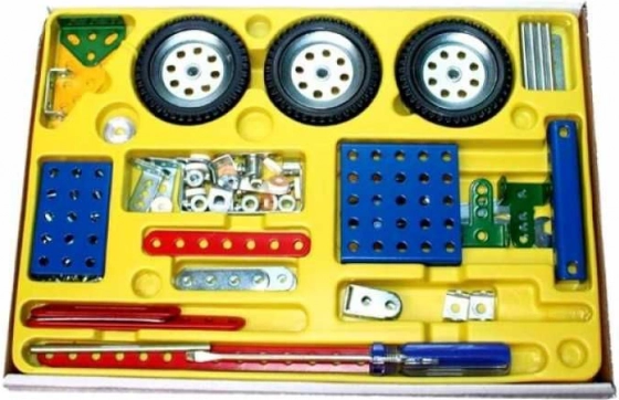Discover the legendary Czech construction set MERKUR that combines fun and learning. The set with 174 sturdy metal parts, wheels, screws, and nuts lets you build an off-road motorcycle, a bike with a sidecar, and a playful tricycle. Thanks to the clear manual, even beginners can handle the builds.
