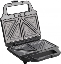 The sandwich maker is equipped with easily maintainable non-stick plates that can be placed in the dishwasher after cooling or wiped with a damp cloth. Safety during use is ensured by a heating indicator light, automatic temperature control, a cool-touch handle, and a safety lock for the plates. Non-slip feet ensure the device's stability.