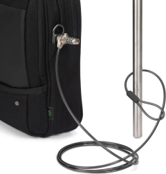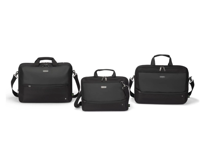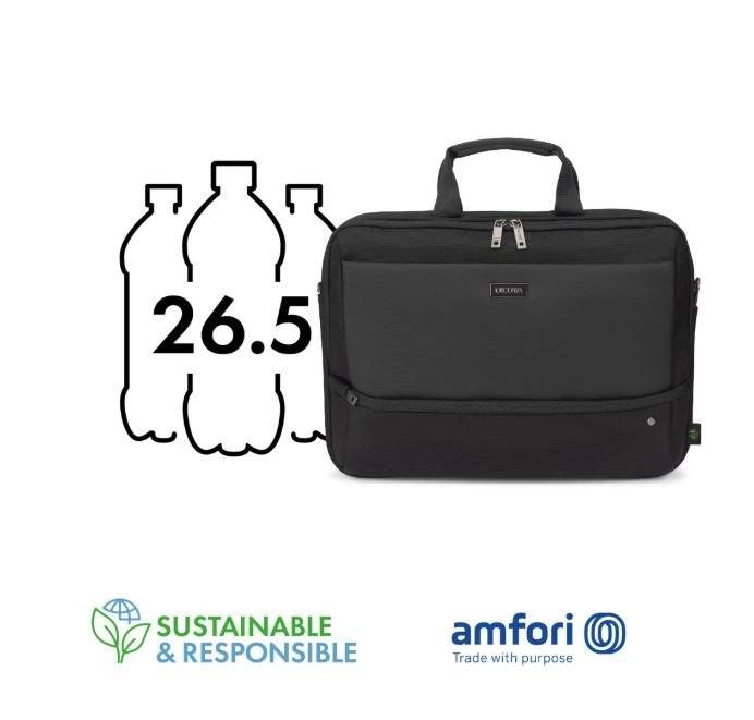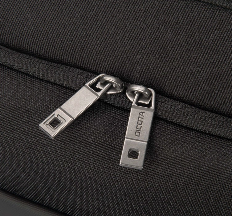Top Traveller FIVE offers a lockable compartment for notebooks with DCT Notebook Protection, HDF foam, and EVA cushioning for maximum security. An integrated tablet pocket allows for the secure storage of devices up to 12.9 inches. The main compartment provides ample space for documents, folders, or mobile devices, while the front section has organized pockets for accessories. A small front pocket offers additional storage space for cables and smaller items. The bag is made from 26.5 recycled PET bottles, contributing to environmental protection.