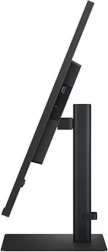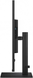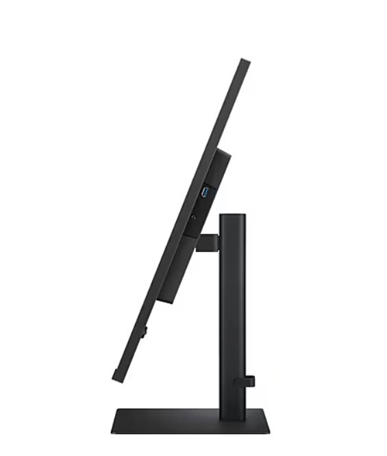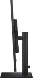 A side view of the monitor reveals its slim profile. The stand allows height and tilt adjustments for ergonomic comfort.