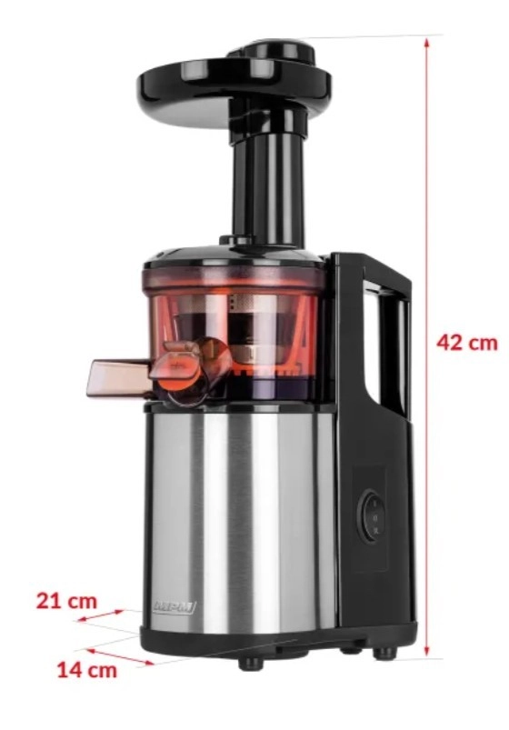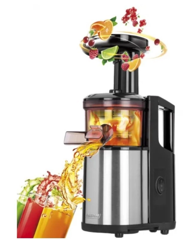 The device operates at low speeds (60 rpm), thus pressing juice precisely and evenly. The internal screw ensures slow and precise pressing without excessive heating and foaming of the juice. It allows obtaining a drink from most types of vegetables, fruits, and herbs, including those that cannot be processed in a standard juicer, such as parsley, spinach, lettuce, wheatgrass, raspberries, currants, pineapple, mango, and more.