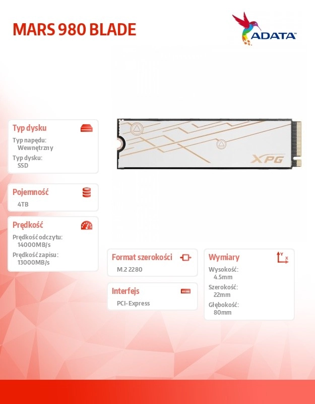 SSD Disk XPG Mars Blade is the first PCIe 5.0 SSD designed for laptops. With lightning-fast read/write speeds up to 14,000/13,000 MB/s and a capacity of up to 4TB, it provides stable performance for the most demanding tasks.