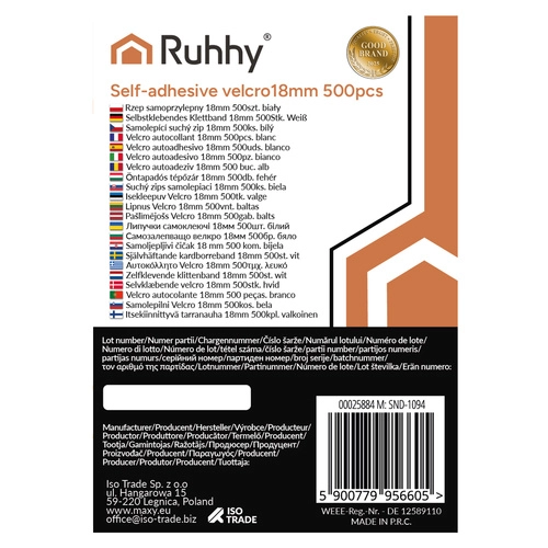 The Ruhhy Velcro includes two parts: hook and loop, which allow for a strong and repeated connection. Thanks to the self-adhesive layer, installation is quick and suitable for various surfaces from plastic to glass.