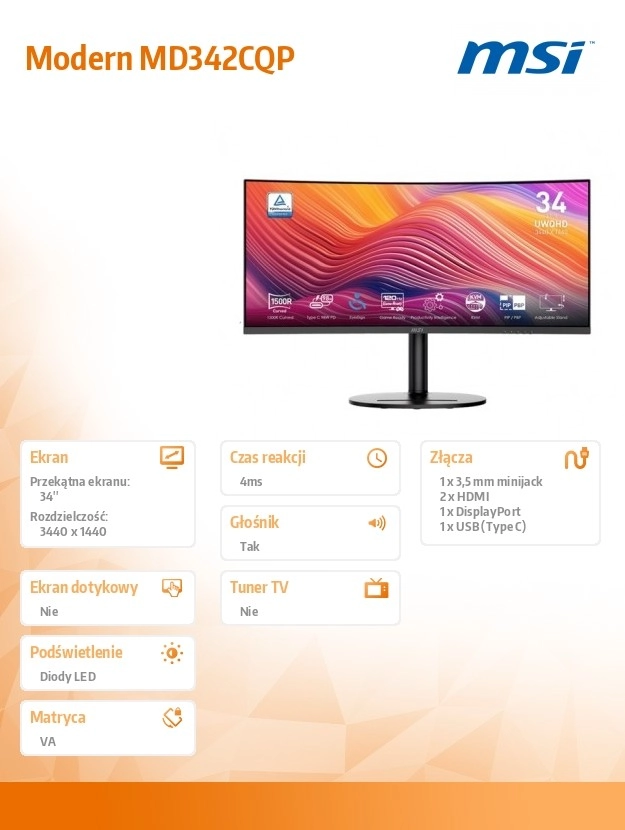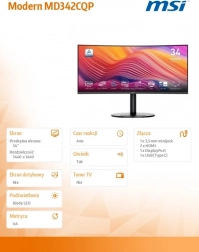Enjoy an immersive view on the 34" curved ultrawide Modern MD342CQP with UWQHD resolution and a smooth 120 Hz refresh rate. The wide aspect ratio is ideal for multitasking, work, and entertainment, while the crisp LED panel and ergonomic stand ensure comfortable viewing all day long.
