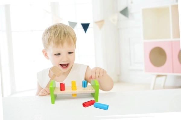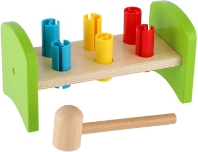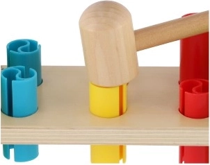 Wooden hammer bench with mallet in vibrant colors is an ideal toy for developing fine motor skills. The package includes a stable and rocking hammer bench with a mallet and 6 colorful pegs.