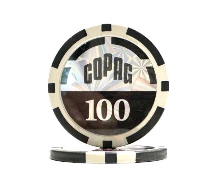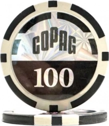 Basic poker set in a black metal case containing 300 chips with hologram and denomination values, two decks of COPAG Jumbo Face cards and all the accessories for the perfect poker fun.