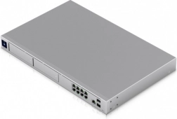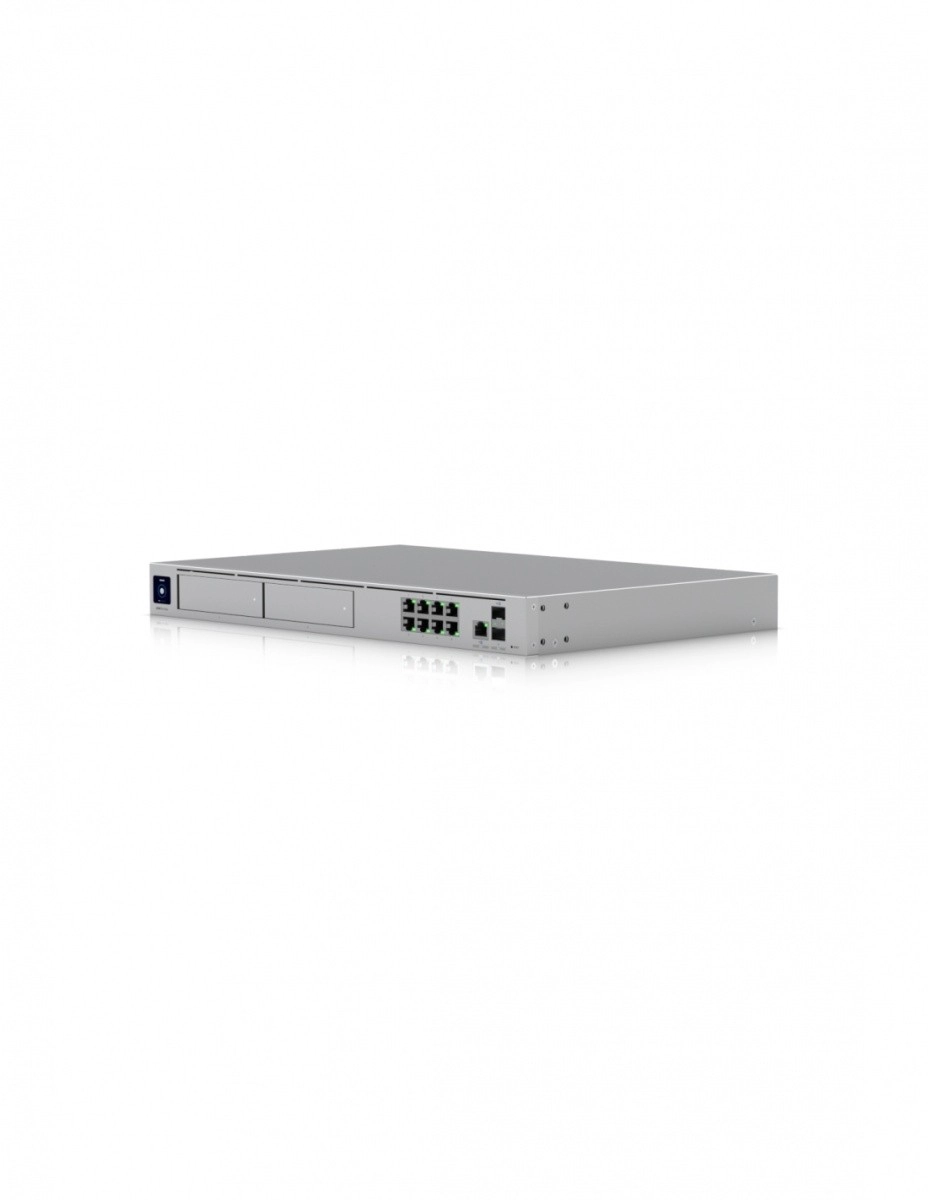 The UniFi Dream Machine Pro Max is a high-performance cloud gateway with throughput up to 10 Gb/s that can manage over 200 UniFi devices and more than 2,000 clients. It offers fast 5 Gb/s routing with IDS/IPS, 10G SFP+ ports, 8× GbE LAN, and 2.5 GbE WAN. Thanks to increased performance and memory, it achieves double the efficiency compared to UDM Pro/SE. The integrated NVR with two 3.5" bays with RAID and a 128 GB SSD for smart recordings with detection is complemented by a 1.3" touch display and the complete UniFi application suite.