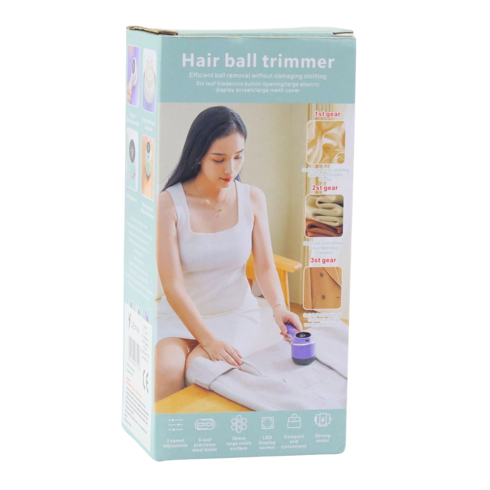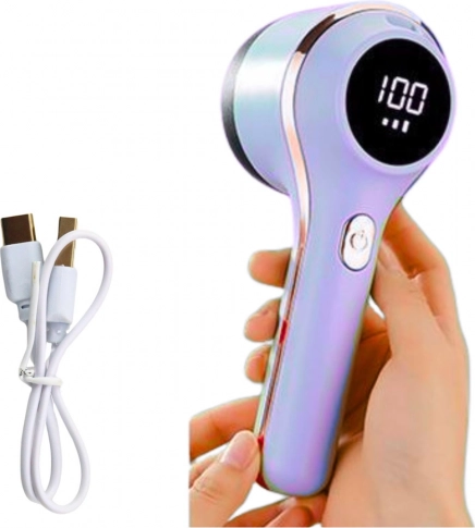 Electric fabric shaver with LED display, 3 speeds and 6 blades. USB charging, auto shut-off, purple design. Gently restores fabric appearance.