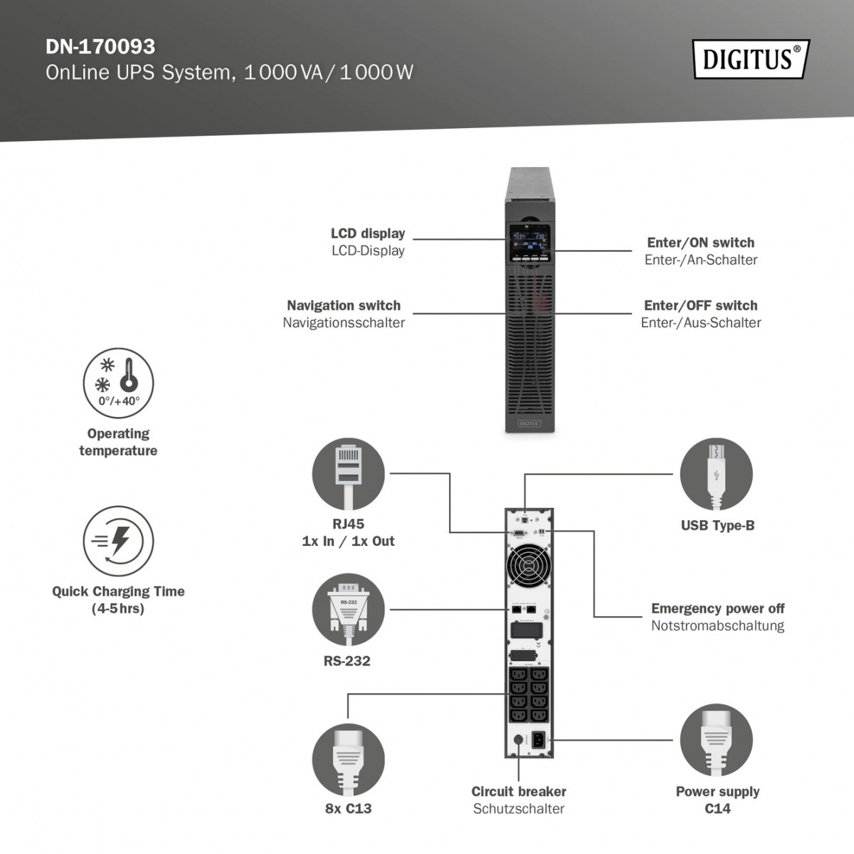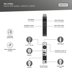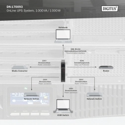 The professional DIGITUS Online UPS is designed for continuous protection of servers, network devices, and workstations. Double conversion with microprocessor control ensures a pure sine wave and stable voltage without switching, protecting data and hardware during outages, undervoltage, or overvoltage. Thanks to high efficiency and a powerful charger, it is suitable for demanding corporate environments.