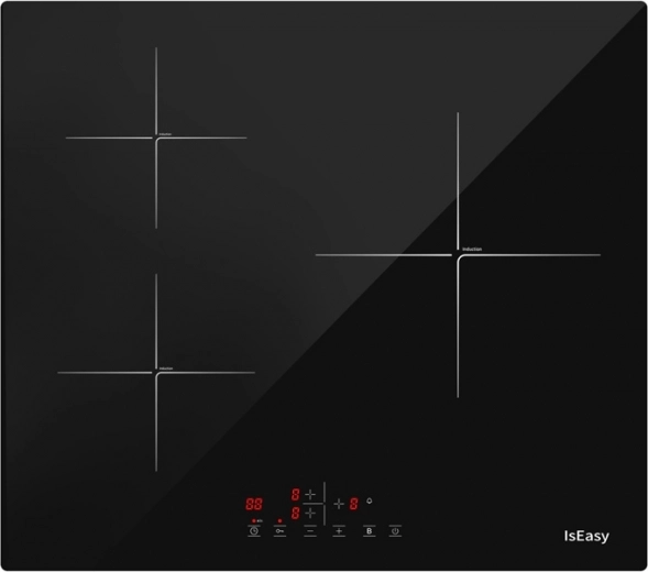 The modern IsEasy induction hob with 3 cooking zones, up to 2600 W per zone in Booster mode, 9 power levels, and touch controls delivers fast and precise cooking. It offers a timer up to 99 minutes, a child lock, a residual heat indicator, and quiet operation. The minimalist black design fits perfectly into any kitchen.