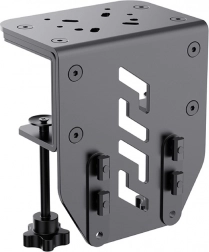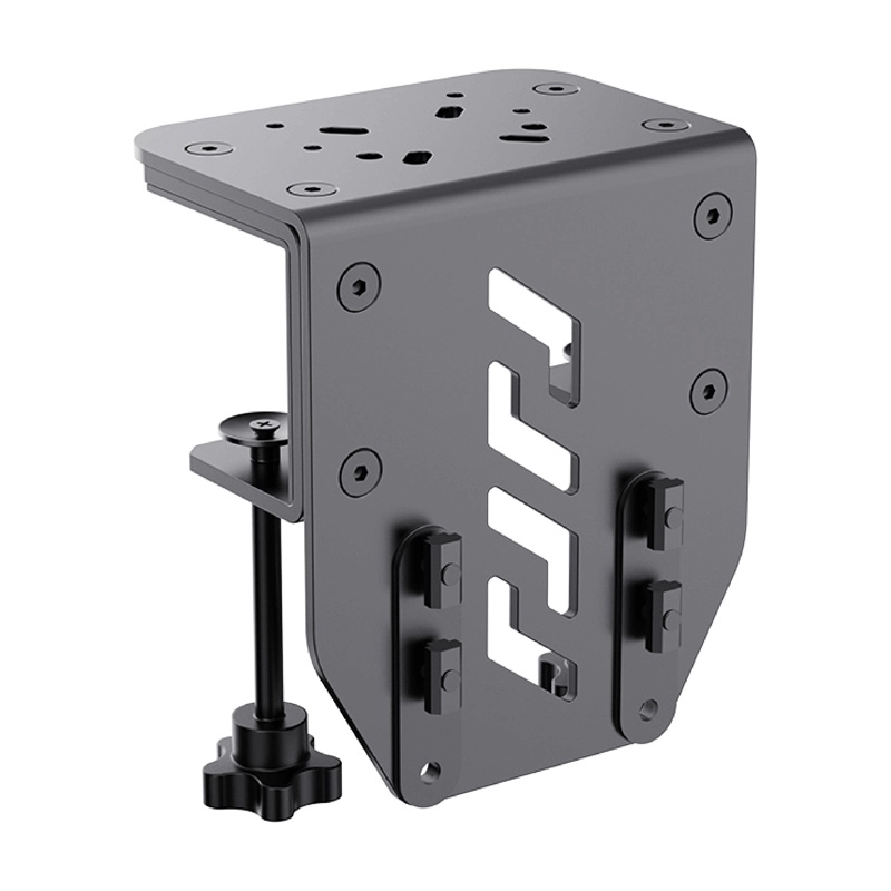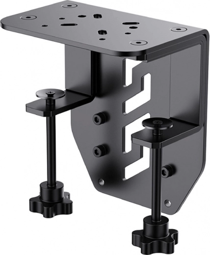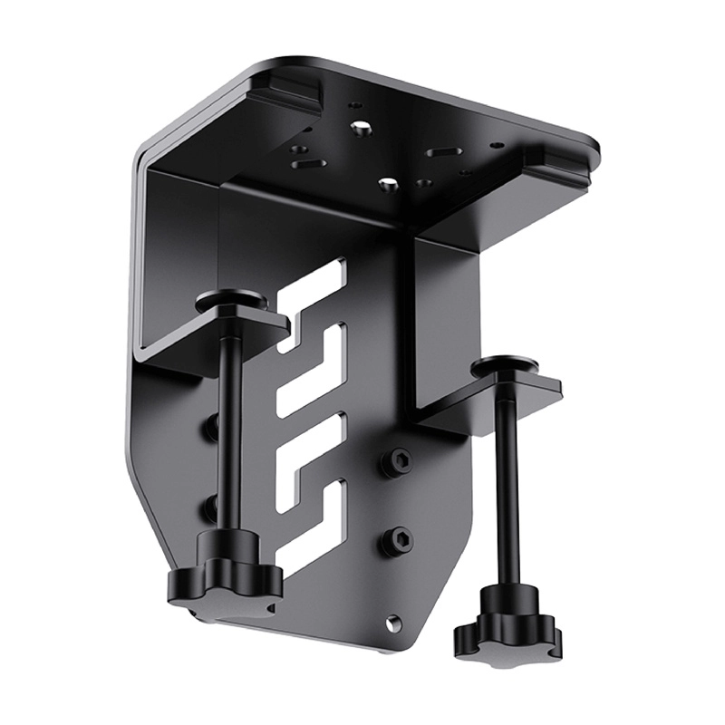 The universal mounting allows installation on the top edge of the desk or onto a stand after removing the C-shaped plate. The compact design saves space and supports an ergonomic layout for both home and professional sim rigs.