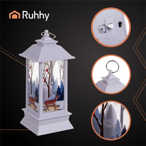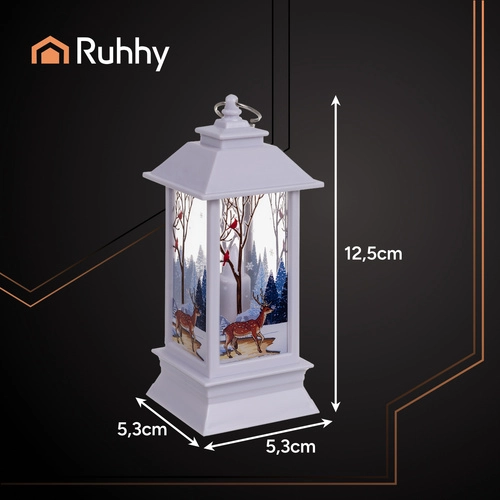 Elegant white RUHHY Christmas lantern with a winter forest motif creates a magical home atmosphere. Inside it has energy-saving warm LED light that mimics a candle flame – safe, smokeless, and cordless. Thanks to battery power, you can easily place it on a table, sideboard, windowsill, or in a display and instantly give your interior a festive vibe.