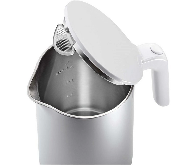 Seamless stainless steel chamber with inner level marks up to 1.5 l and a fine stainless steel spout filter ensures clean pouring and better-tasting water.