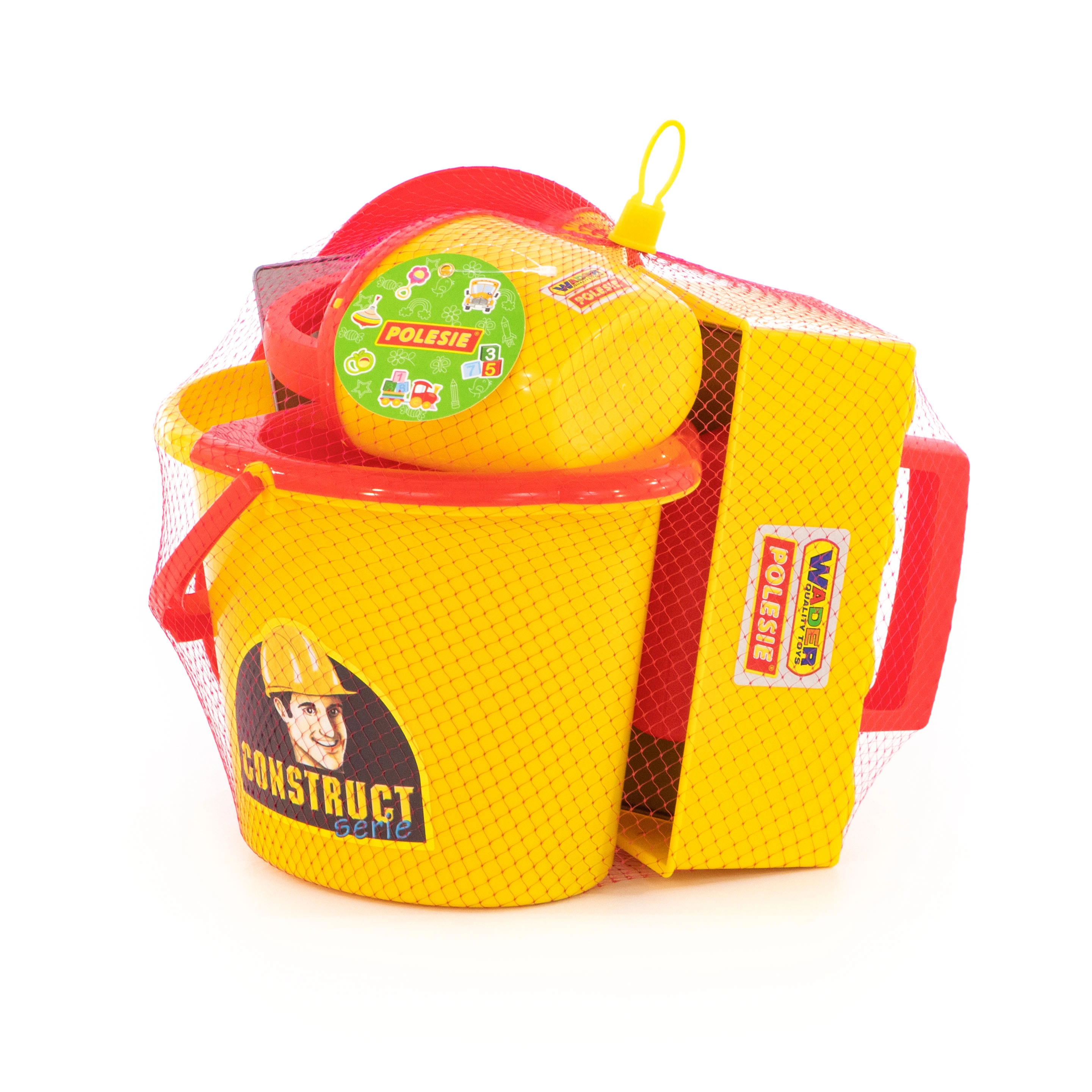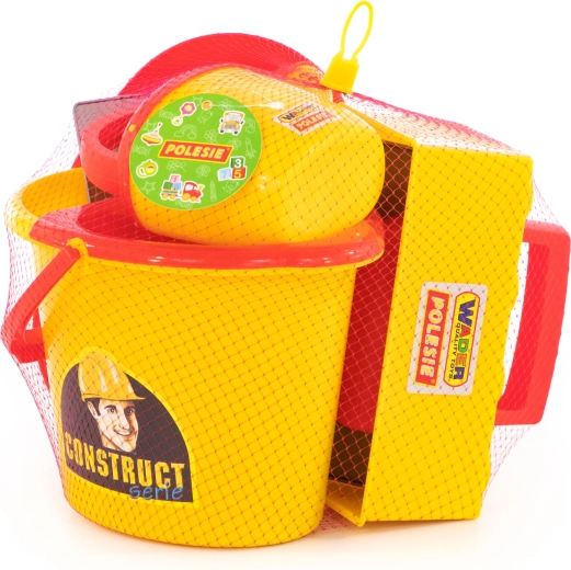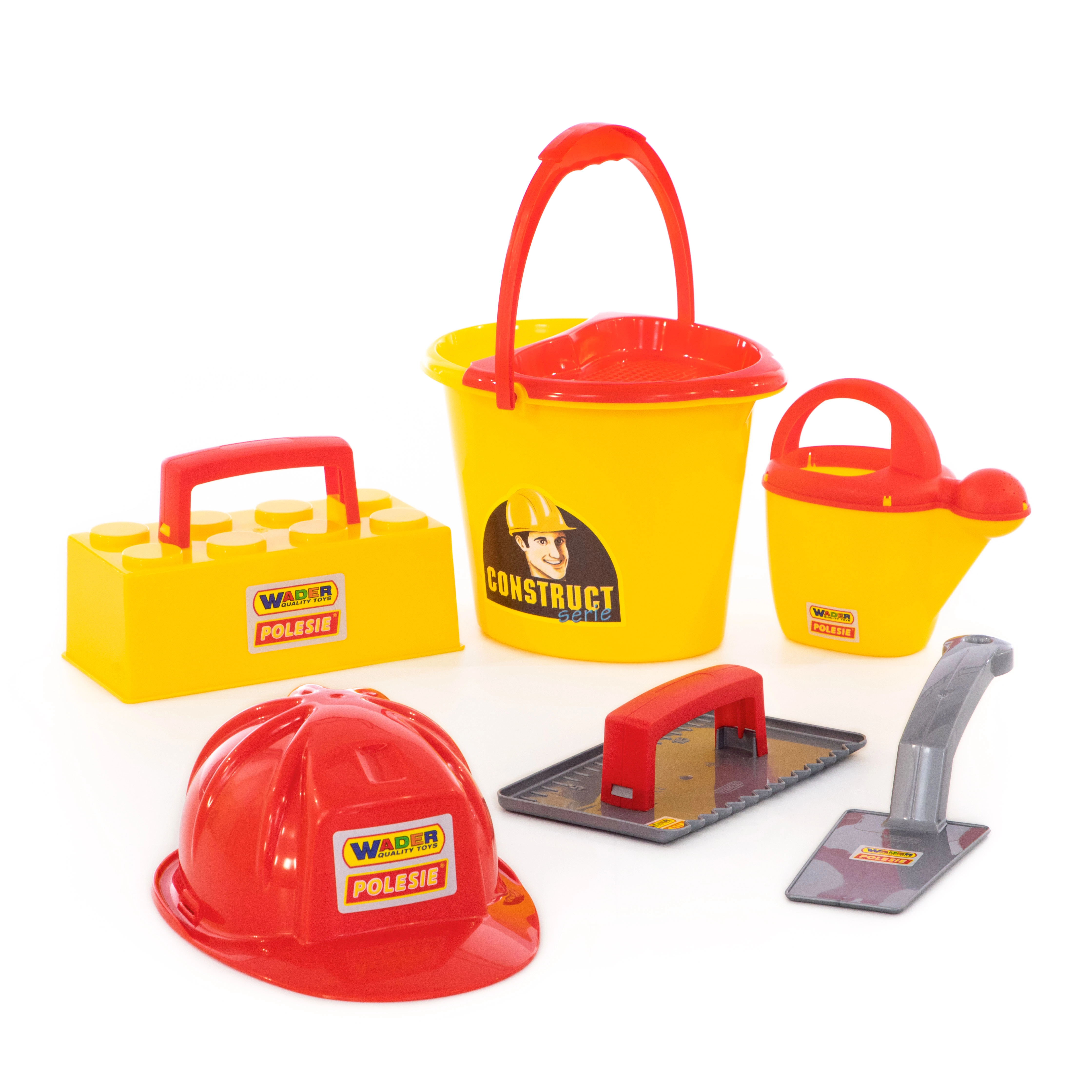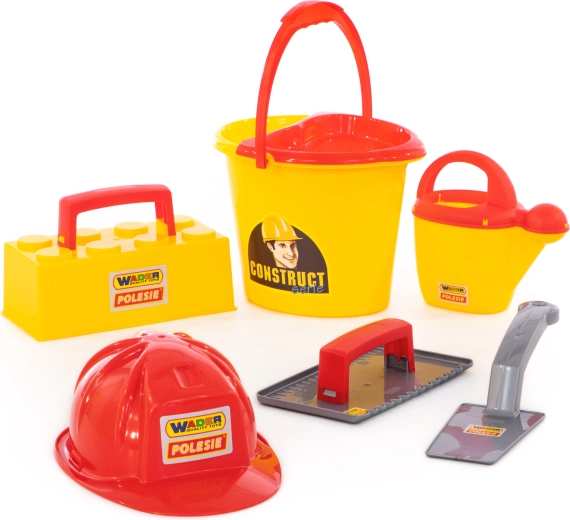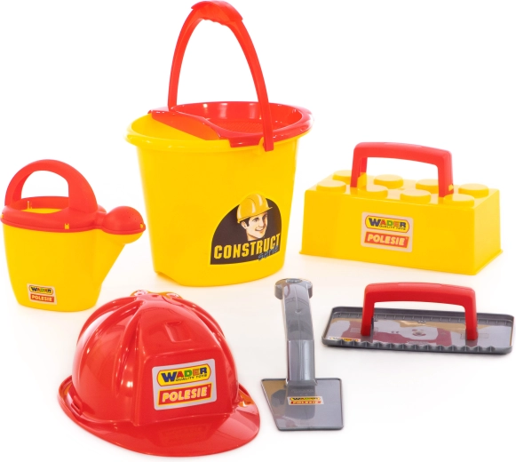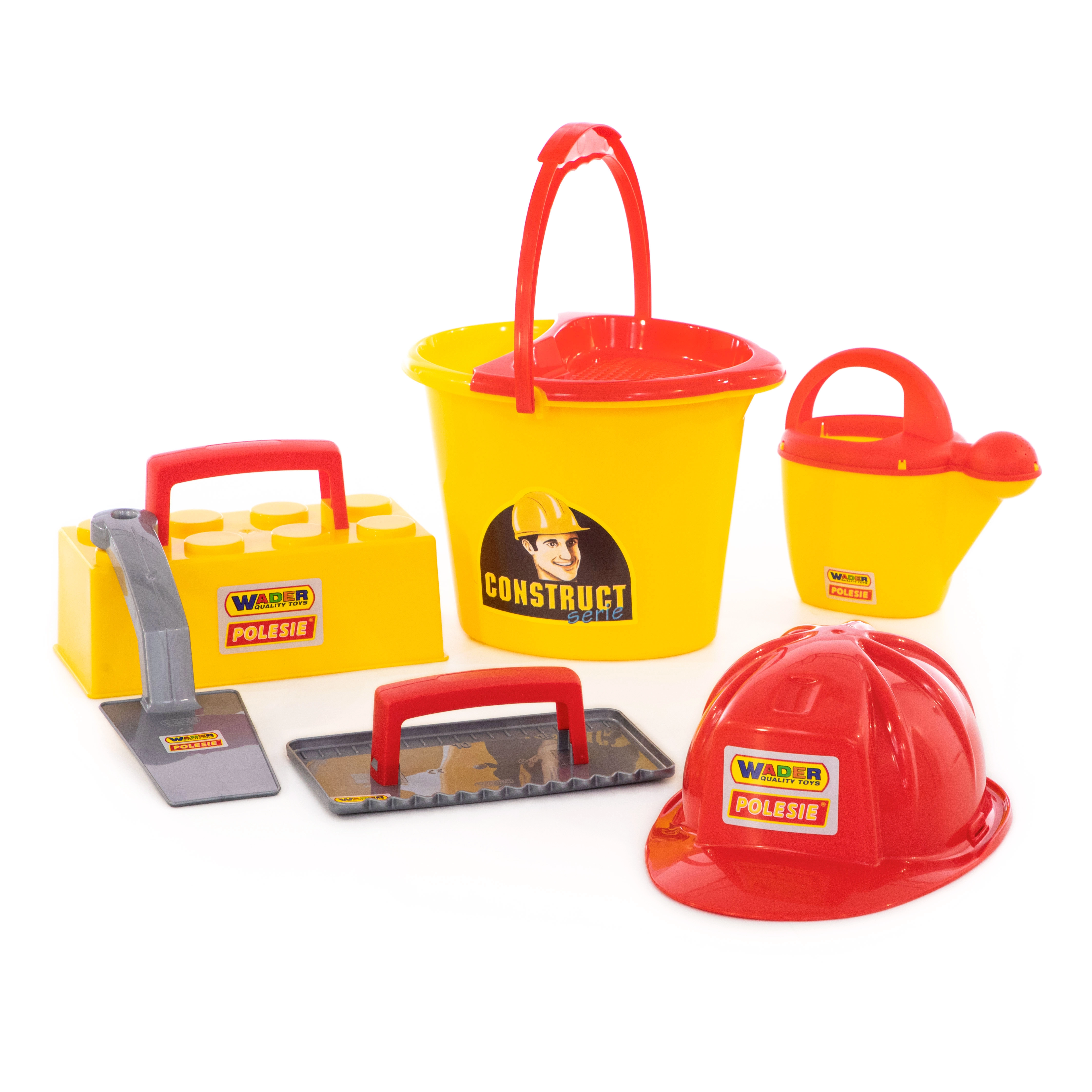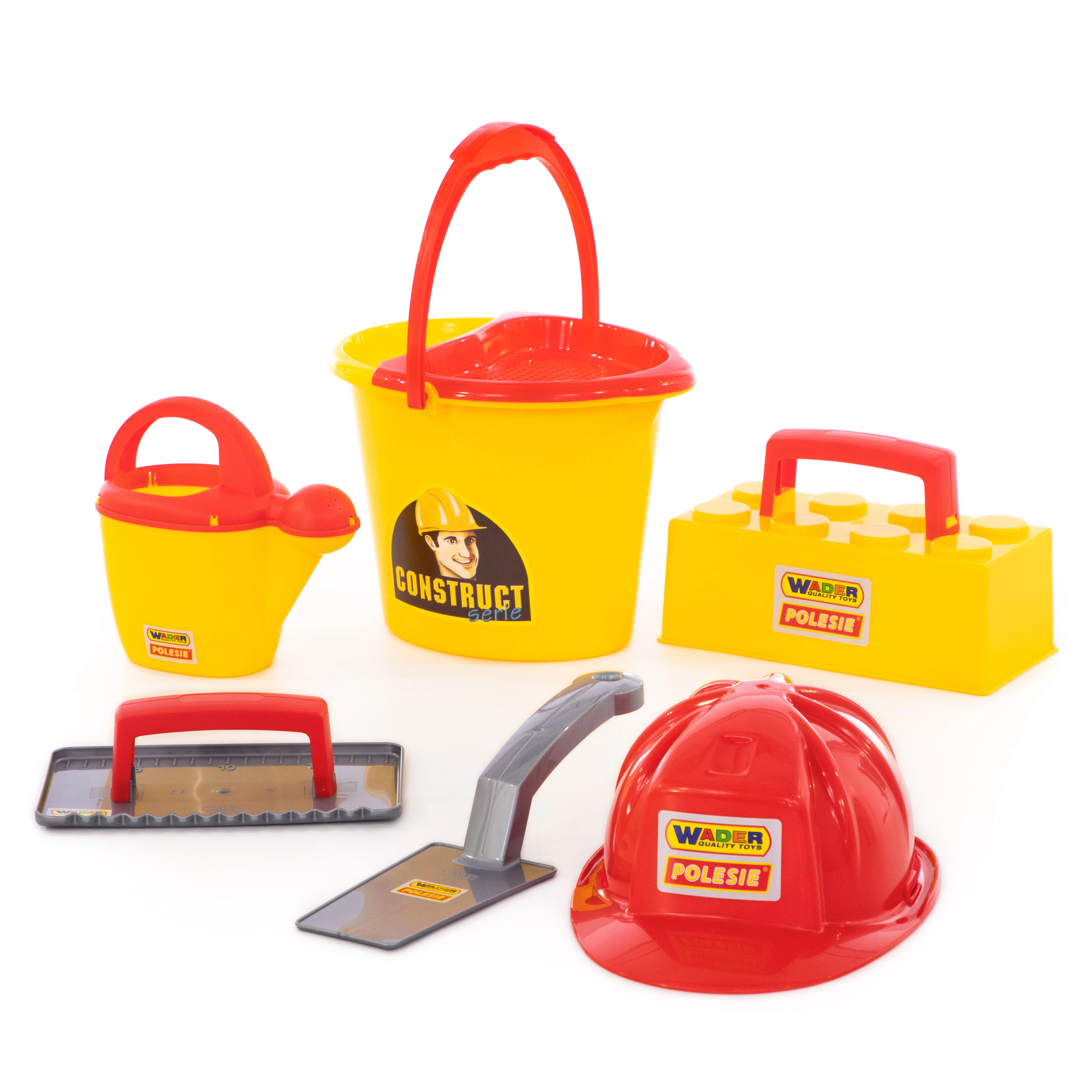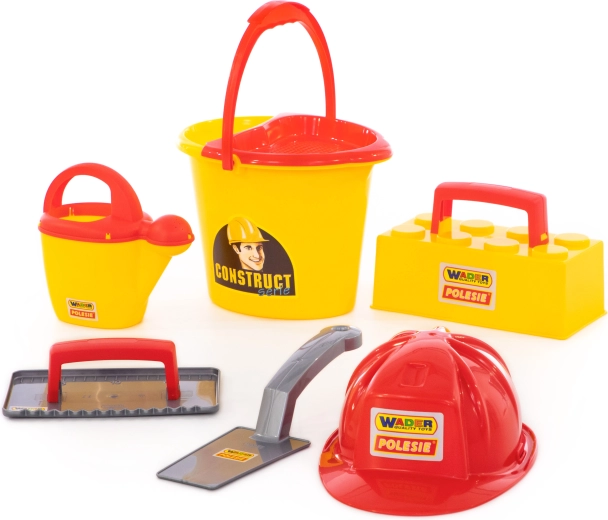 Everything in one: bucket, watering can, masonry trowel, float, brick mold, and helmet – ready for the sandbox or the beach.