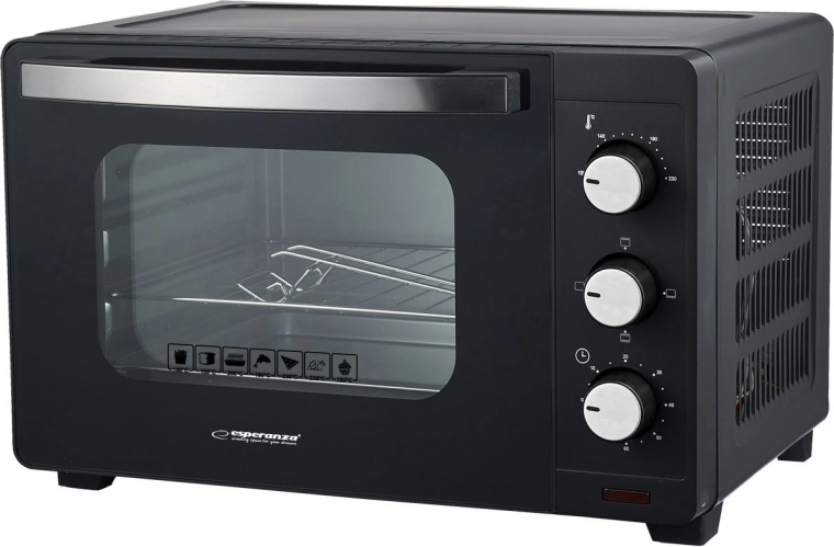 The compact ESPERANZA PROSCIUTTO mini oven with a capacity of 20 L is ideal for a small kitchen, a cottage, or an office. It offers 3 baking functions, smooth temperature control from 100–230 °C, and a 60-minute timer. Thanks to the double heat-resistant glass, it provides better insulation and safer operation. The package includes a pizza tray, a grill rack, and a pan holder for convenient cooking.