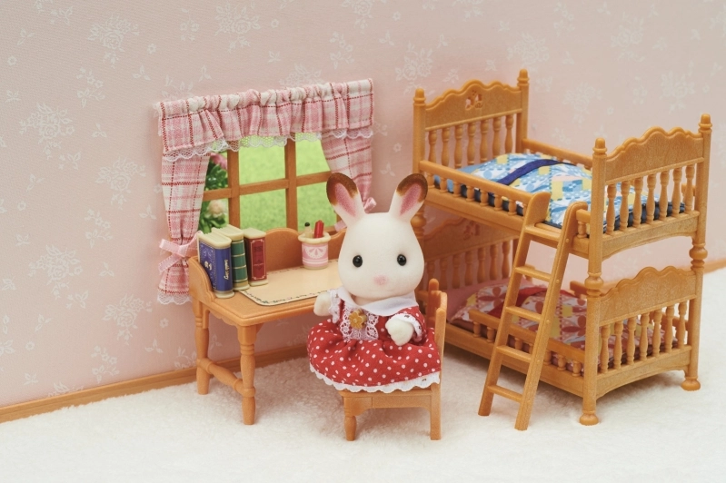 Create a cozy nook for study and rest with the SYLVANIAN FAMILIES country children’s room. The bunk bed comfortably accommodates two figures and looks realistic thanks to the ladder and soft bedding. The desk with chair and a rich set of accessories, such as books, a clock, and a globe, invites kids to act out everyday scenes.