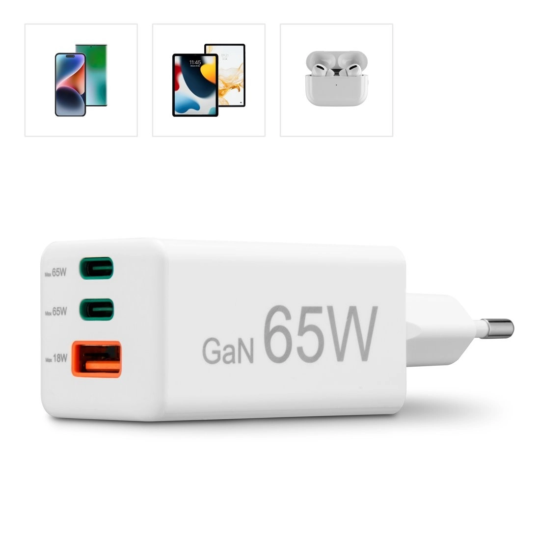Modern GaN chips ensure high efficiency, less heat, and a compact size while delivering up to 65 W for fast charging of phones, tablets, and laptops.