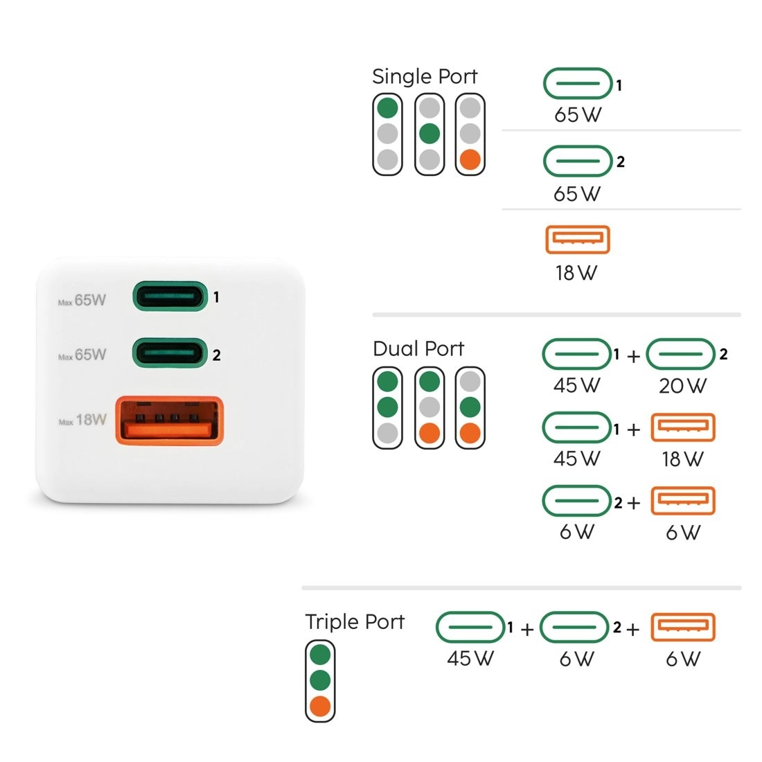 - USB‑C1: 65 W; USB‑C2: 65 W; USB‑A: 18 W