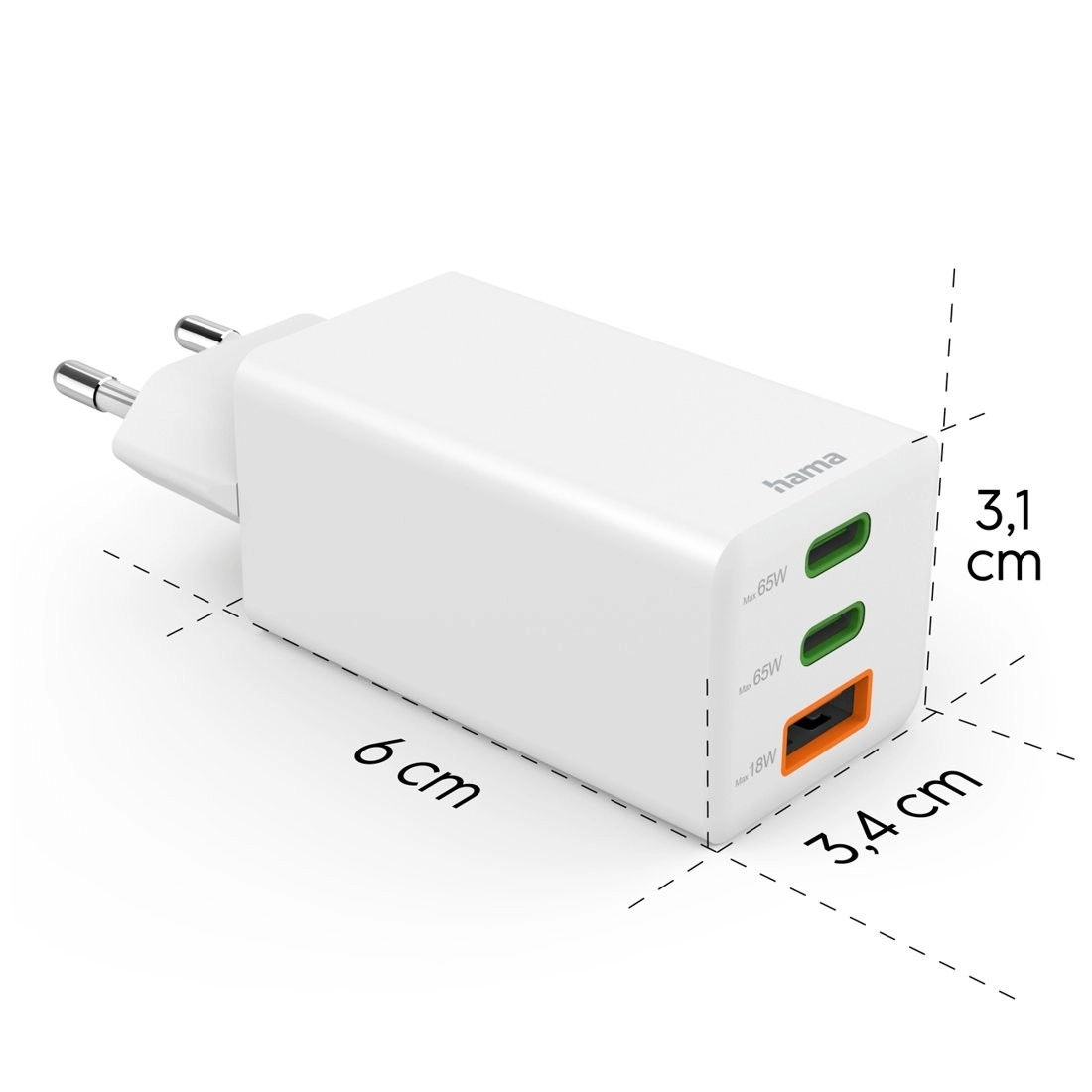 The compact Hama wall charger with GaN technology and 65 W output quickly charges your phone, tablet, and laptop. It supports Power Delivery and Quick Charge, and offers 2× USB‑C + 1× USB‑A for simultaneous charging of three devices. It provides safe charging, smart current management, and up to 60% in 30 minutes on compatible phones.